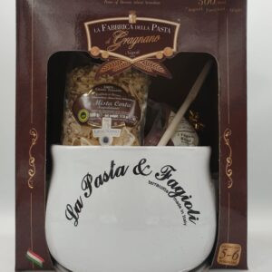 Кутията съдържа: 1 глинен съд; 1 опаковка боб фаджоли 400гр. (Съставки: боб фаджоли. Произход на културата: Канада. Средни хранителни стойности за 100 g продукт: Енергия: 1216kJ/291kcal, Мазнини 2g, от които наситени 0g; Въглехидрати 47g, от които захари 3g, Фибри 17g, Протеини 20g, Сол 0g.); 1 пакет паста от твърда пшеница 500 гр. (Съставки: брашно от твърда пшеница, вода. Може да съдържа следи от соя. Средни хранителни стойности за 100g продукт: Енергия: 1486KJ / 350Kcal; Мазнини: 1g;, от които наситени: 0,3 g; Въглехидрати: 73g, от които захари: 2,5g; Фибри: 1g; Белтъчини: 13g; Сол: 0,005g.); 1 брой дървена лъжица. Да се съхранява на сухо и прохладно място.